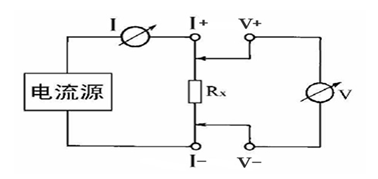 由電流源經“I+、I-兩端口(也稱I型口),供給被測電阻Rx電流,電流的大小有電流表I讀出,Rx兩端的電壓降“V+、V-”兩端口(也稱V型口)取出,由電壓表V讀出。通過對I、V的測量,就可以算出被測電阻的阻值。