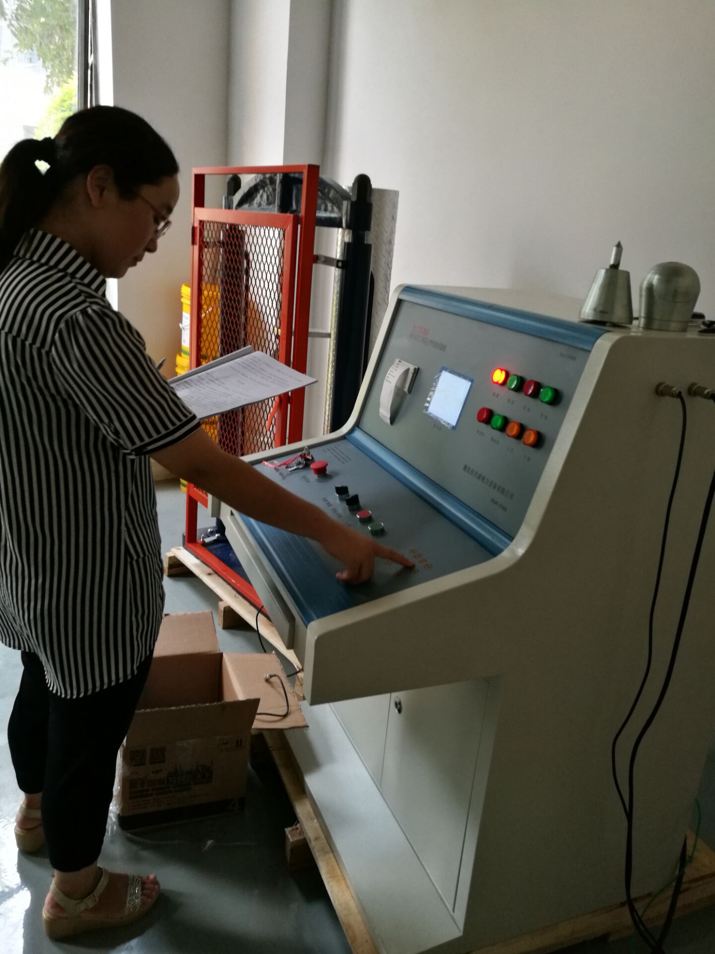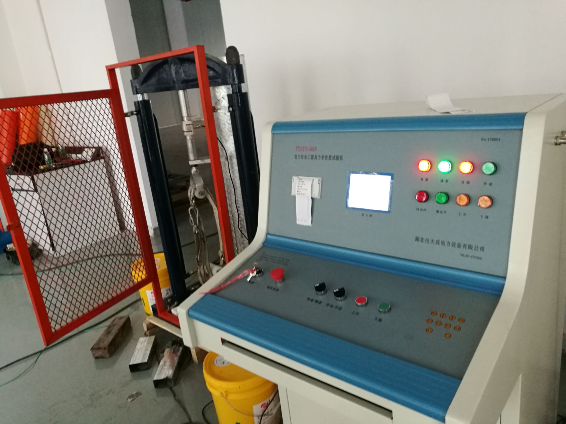 此次培訓(xùn)的重點(diǎn)設(shè)備是YTC6170電力安全工具器具力學(xué)性能測(cè)試機(jī),我公司研制的電子測(cè)力機(jī)(電力安全工器具力學(xué)性能試驗(yàn)機(jī)),符合國(guó)家電力公司《電力安全工器具預(yù)防性試驗(yàn)規(guī)程》要求,按《規(guī)程》完成各種預(yù)防性力學(xué)性能試驗(yàn)。本機(jī)由測(cè)試顯示和加力設(shè)備兩部分組成(如需測(cè)安全帽配安全帽試驗(yàn)臺(tái)) 測(cè)試顯示部分由拉壓力傳感器、控制鍵盤、液晶顯示屏、微型打印機(jī)、手動(dòng)按扭等組成。鍵盤使用薄膜輕觸鍵,使用手感好,液晶顯示為中文菜單式,操作人員可根據(jù)被試對(duì)象選擇相應(yīng)名稱菜單,當(dāng)需要對(duì)測(cè)試結(jié)果打印時(shí),可打印測(cè)試報(bào)告,便于備案檢查。本機(jī)設(shè)置兩個(gè)傳感器接口,傳感器3KN、100KN傳感器為測(cè)試安全工具之用。安全帽測(cè)試為測(cè)試安全帽專用。兩只傳感器既可單獨(dú)使用,也可同時(shí)使用。能滿足不同使用場(chǎng)所環(huán)境的要求和工作要求,性能穩(wěn)定,測(cè)試結(jié)果準(zhǔn)確。