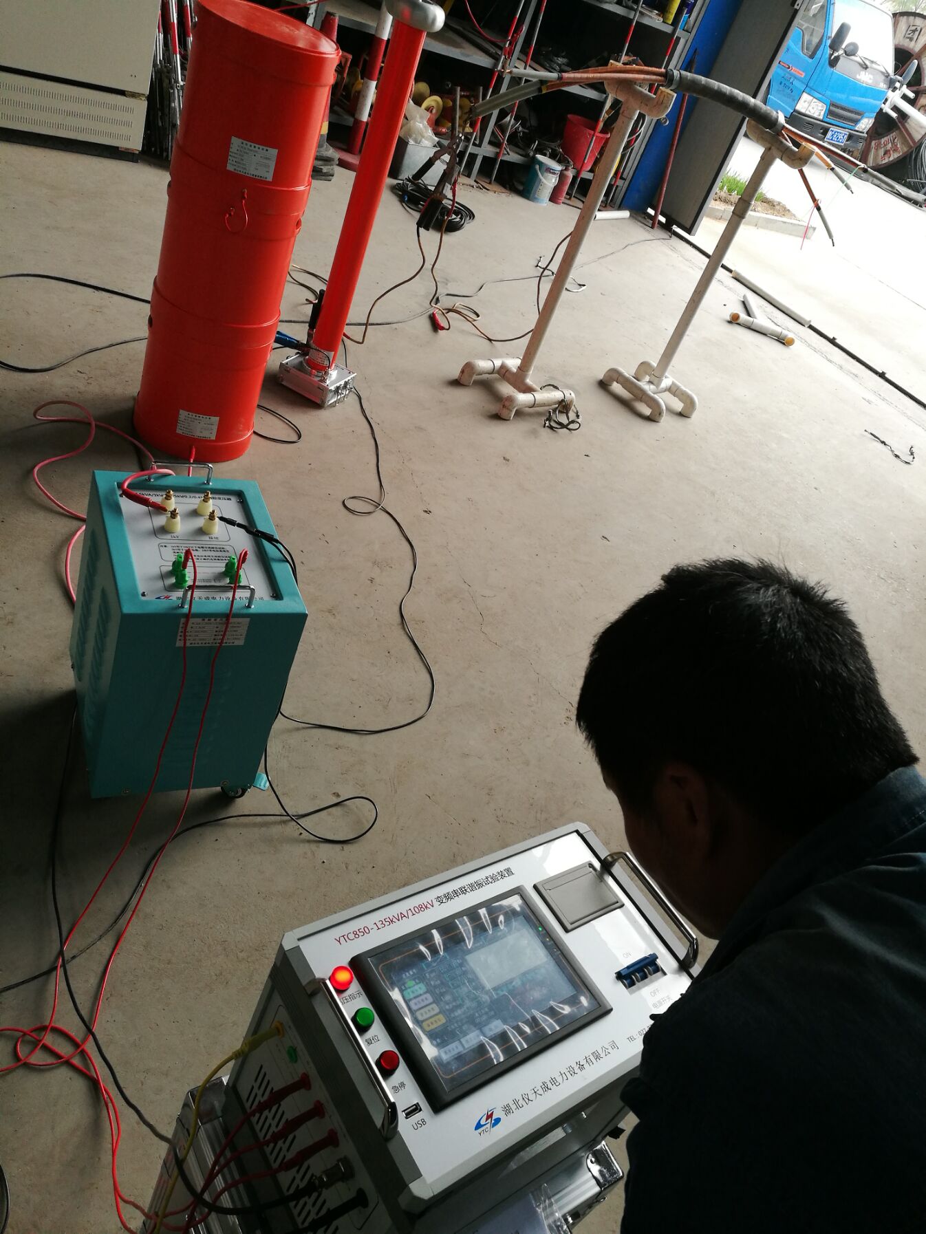 此次培訓(xùn)的設(shè)備和內(nèi)容很多。李工首先對各項設(shè)備的使用,接線方法進行了實地操作和詳細的講解,但此次培訓(xùn)的重點是YTC850-135kVA/108kV變頻串聯(lián)諧振試驗裝置,該設(shè)備具有流、零位啟動、系統(tǒng)失諧(閃絡(luò))等保護功能,過壓過流保護值可以根據(jù)用戶需要整定,試品閃絡(luò)時閃絡(luò)保護動作并能記下閃絡(luò)電壓值,以供試驗分析。整個裝置單件重量很輕,便于現(xiàn)場使用。裝置具有三種工作模式:全自動模式、手動模式、自動調(diào)諧手動升壓模式,方便用戶根據(jù)現(xiàn)場情況靈活選擇,提高試驗速度。