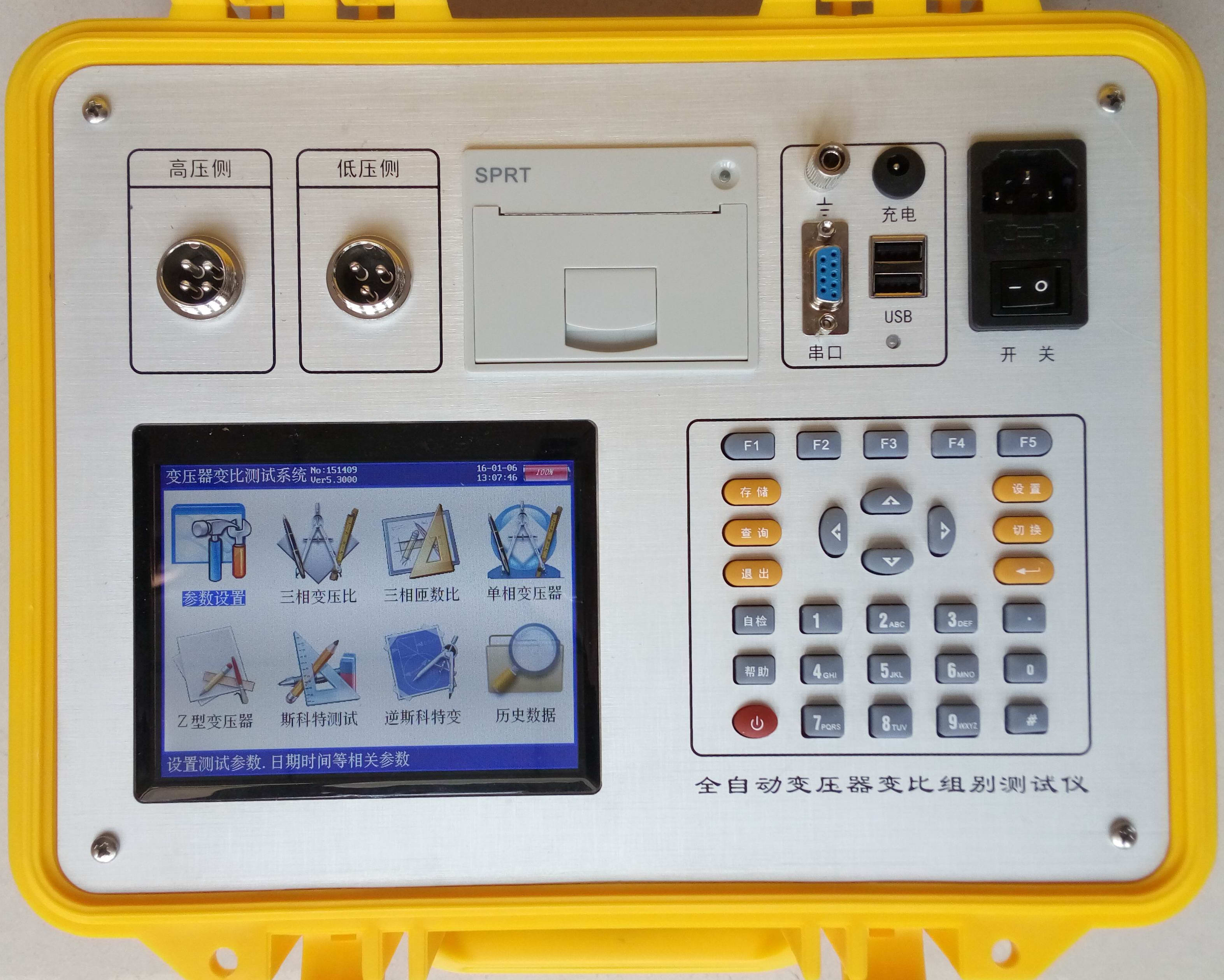 儀器左側上部是變比測試航空插頭,高壓側,低壓側端子。左側下方是彩色液晶屏,右側下部是標準30鍵的控制鍵盤;在儀器的右側上部是打印機、接地端子、充電口、USB接口、RS232接口、電源線插口、工作開關。