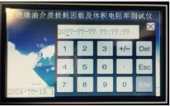 四、在圖5界面中,可以分別對試驗參數進行設置,圖中是設備的默認參數,如需改動,只要點擊需要改動的參數,就會自動彈出一個小鍵盤,如下圖,在小鍵盤中直接輸入需要的參數并點擊小鍵盤上的確認鍵即可,選擇打印的時候只要點擊光標處就可以在是和否之間切換。設定好后點擊確定即可回到主界面,空杯檢測完畢沒有問題后,將油杯的內電極取出置于油杯架上,取40ml待測油樣置于油杯中(注意:注入油樣時一定注意不能出現氣泡,應沿著杯壁緩緩注入),油樣注入后,再將油杯的內電極慢慢的放到位。(動作要慢一些,防止動作太快,排氣不及時,使油樣溢出),接好測量信號線和溫度信號線,點擊圖3中的自動測試,一般測油是都按照規程90℃測量,同樣也可以選擇立即測試,在當前溫度下測量。