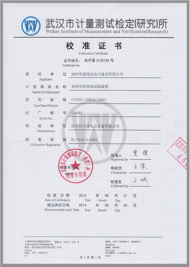 轉載:"YTC850系列電纜交流耐壓試驗裝置鑒定證書" 請注明來源于儀天成電力。 更多技術問題請致電儀天成電力客戶服務:027-87876585,技術部專線:027-87876585,在線客服:719388481